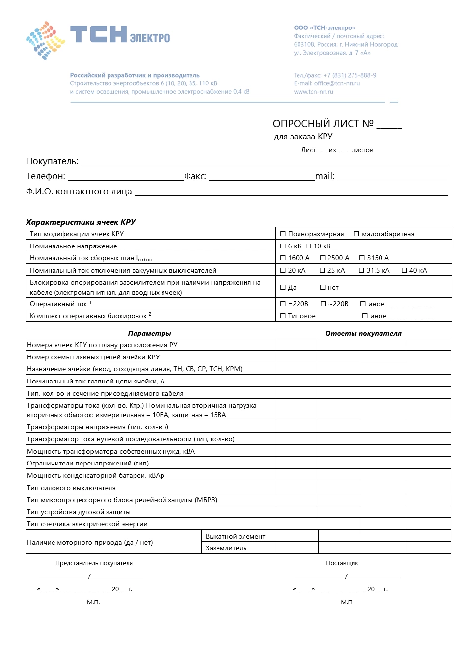Опросный лист для заказа КРУ