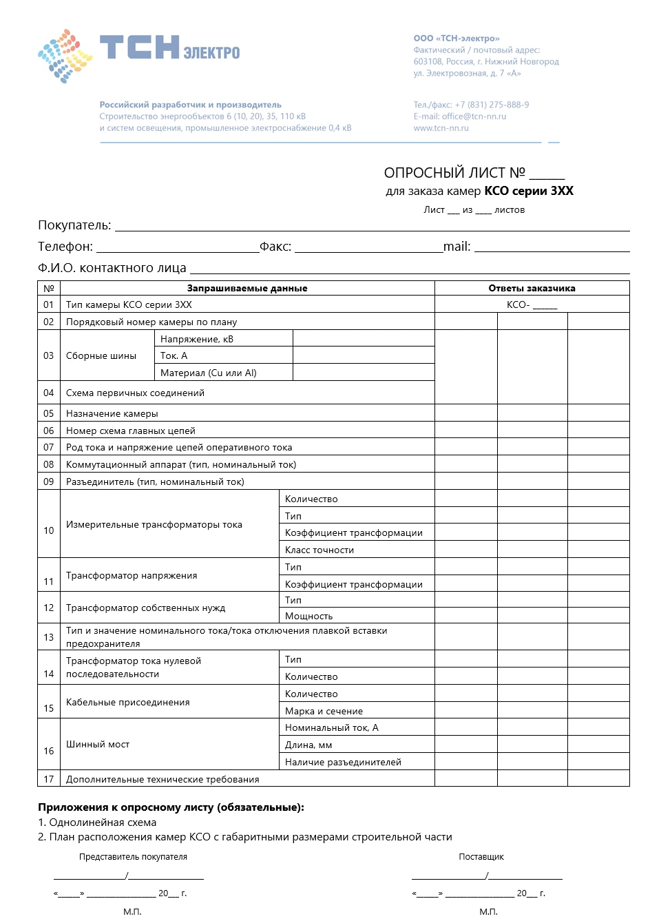 Опросный лист для заказа камер КСО серии 3ХХ