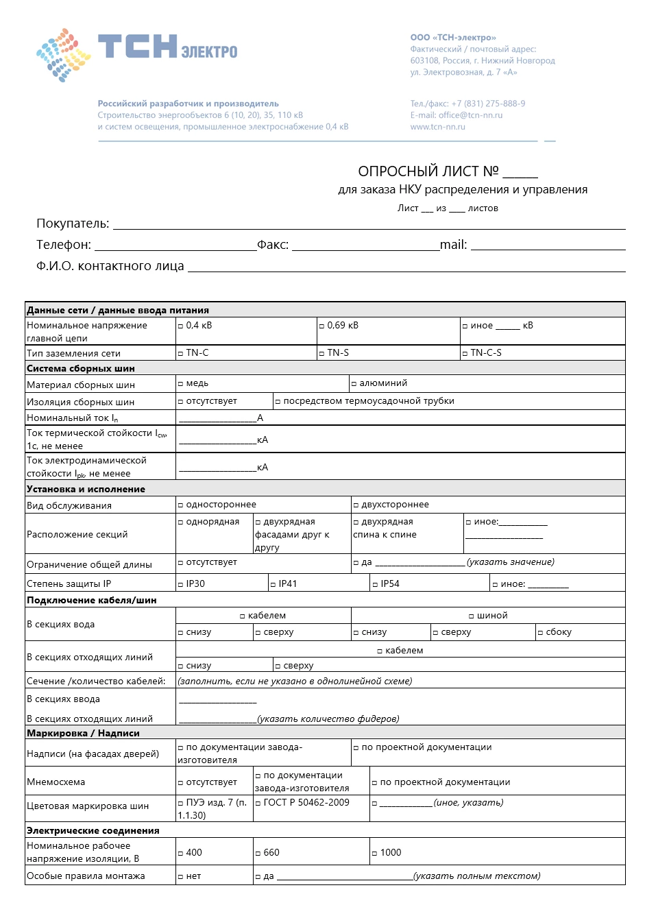 Опросный лист для заказа НКУ распределения и управления