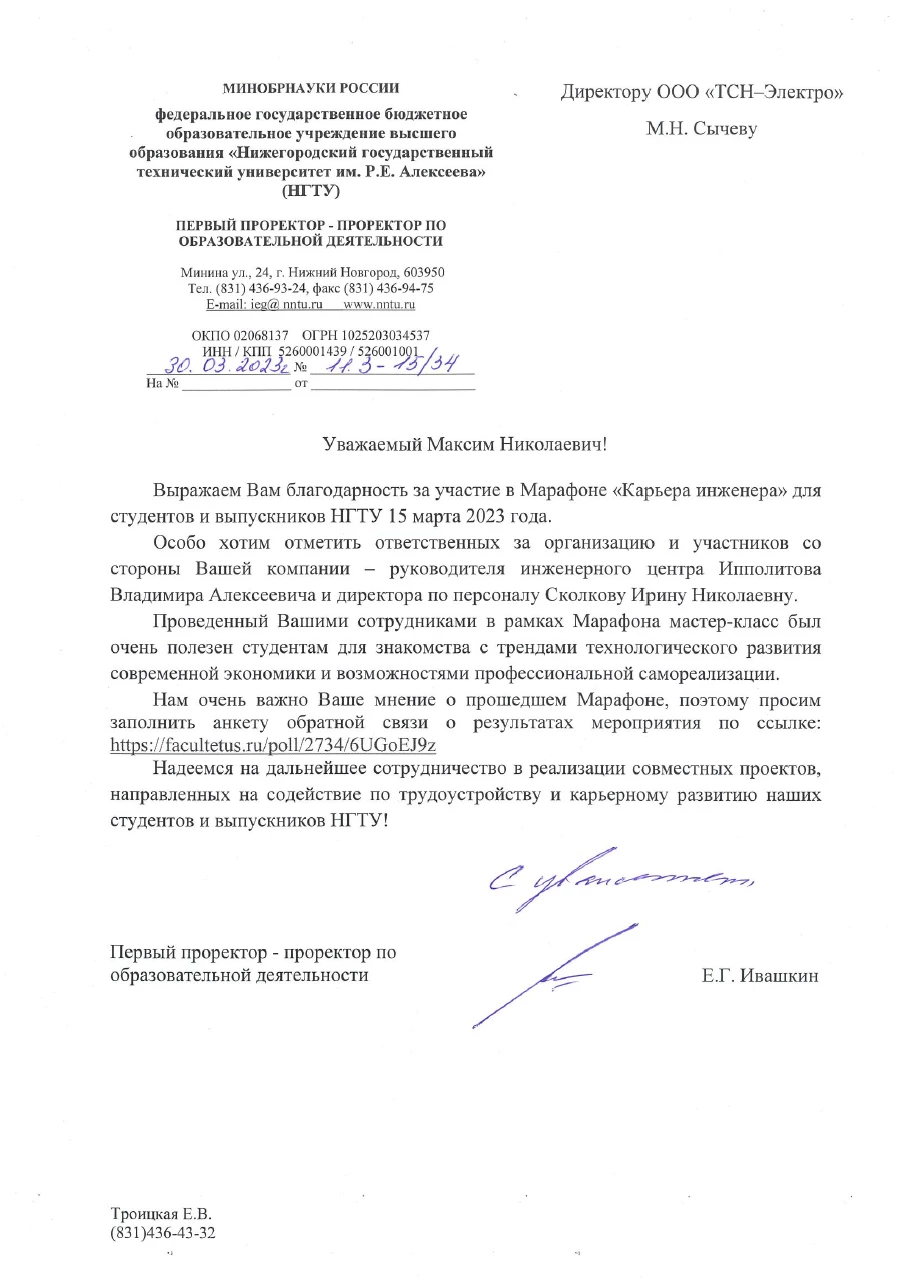 Благодарность от НГТУ им. Алексеева