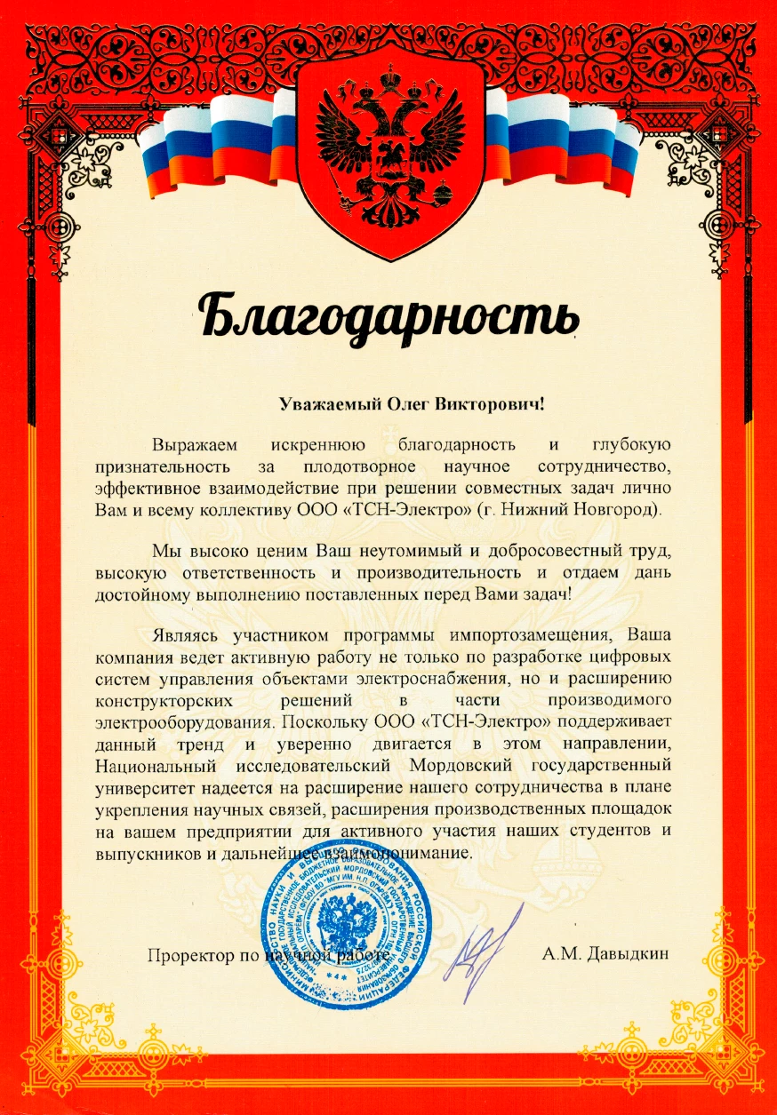 Благодарность от Мордовского государственного университета