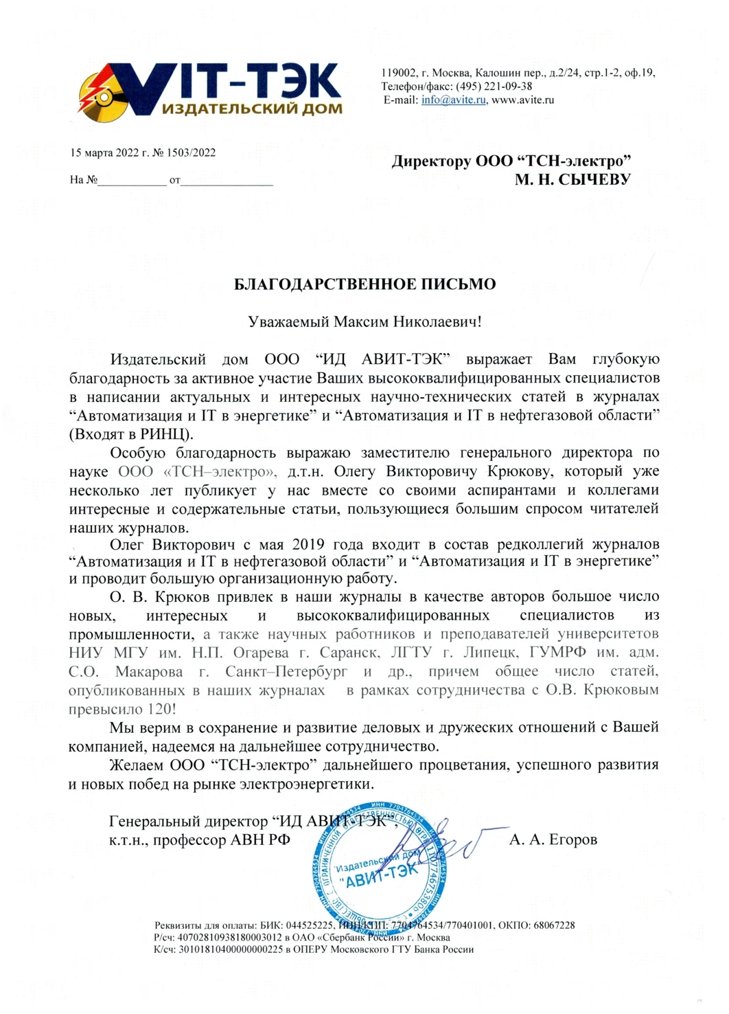 Благодарственное письмо от научно-технического журнала