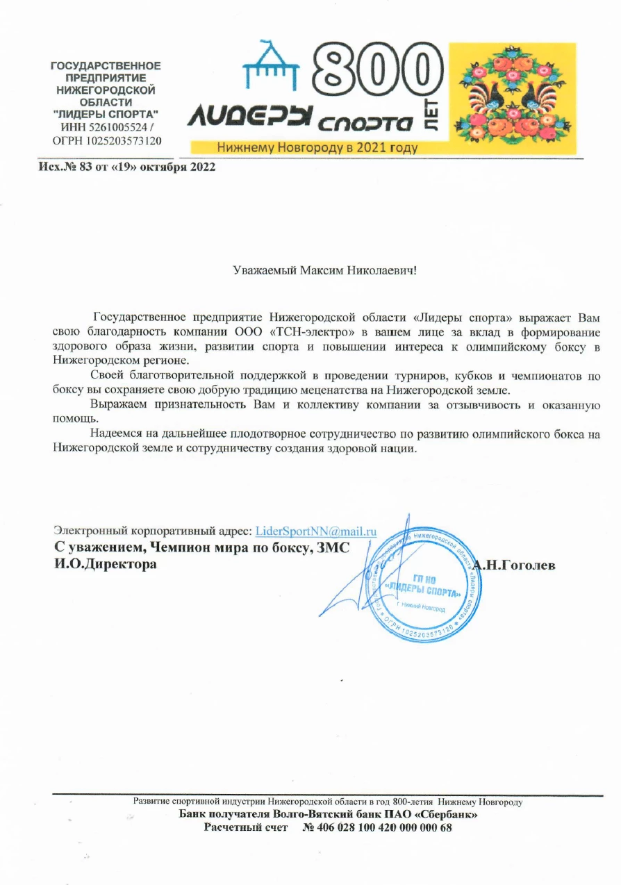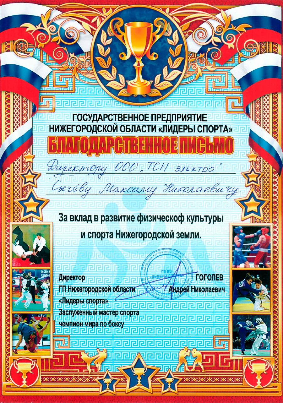 Благодарственное письмо за развитие спорта в Нижнем Новгороде