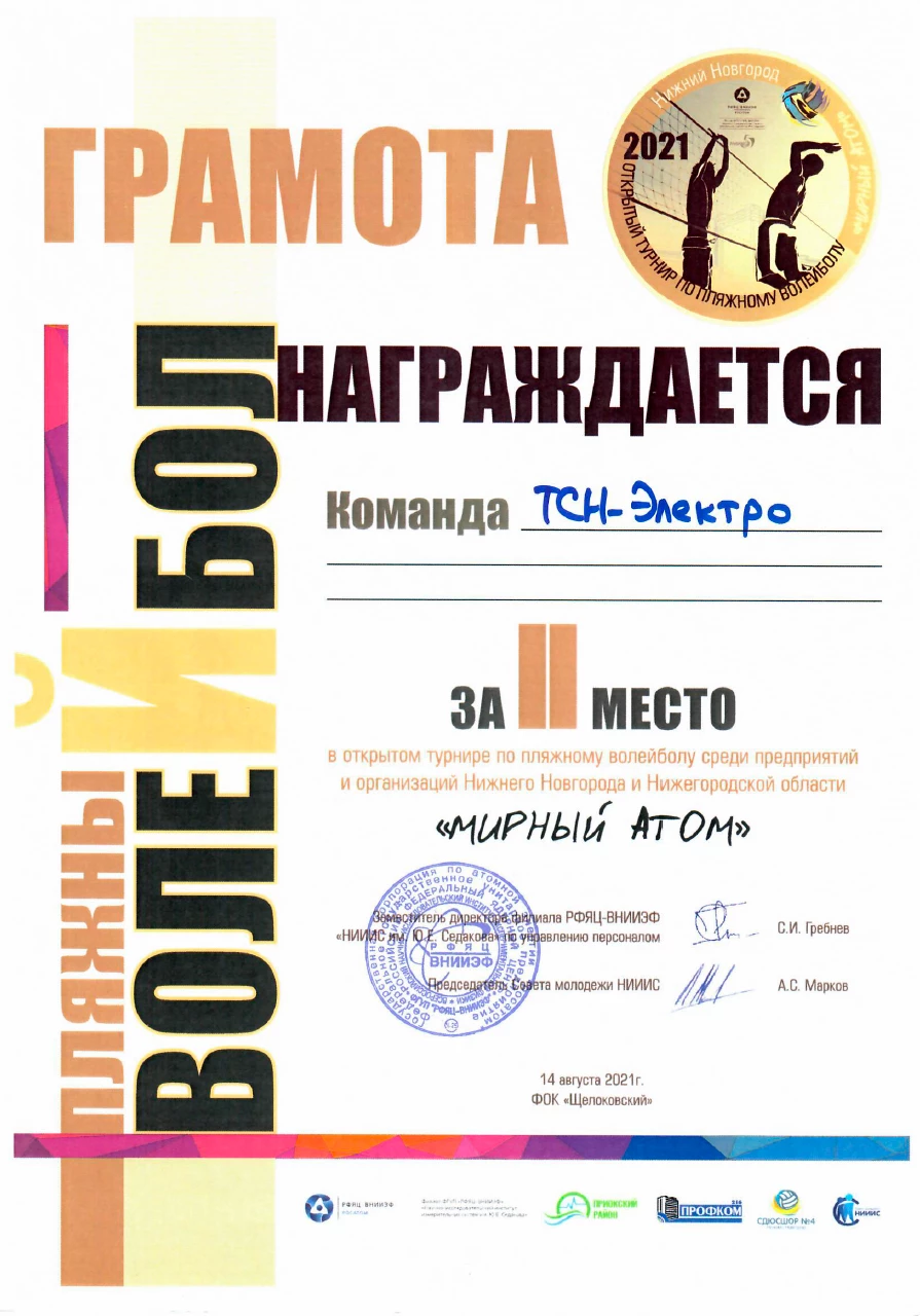 Грамота за 2-е место в тернере по волейболу