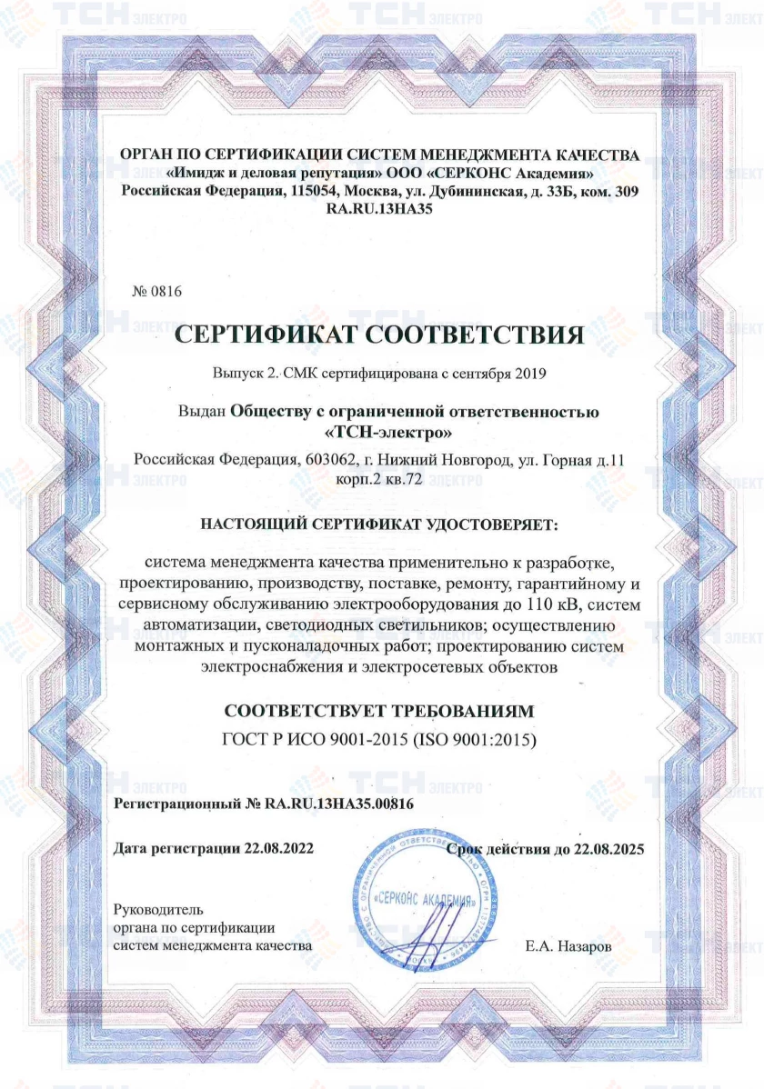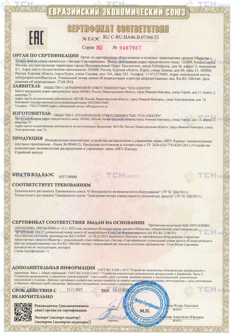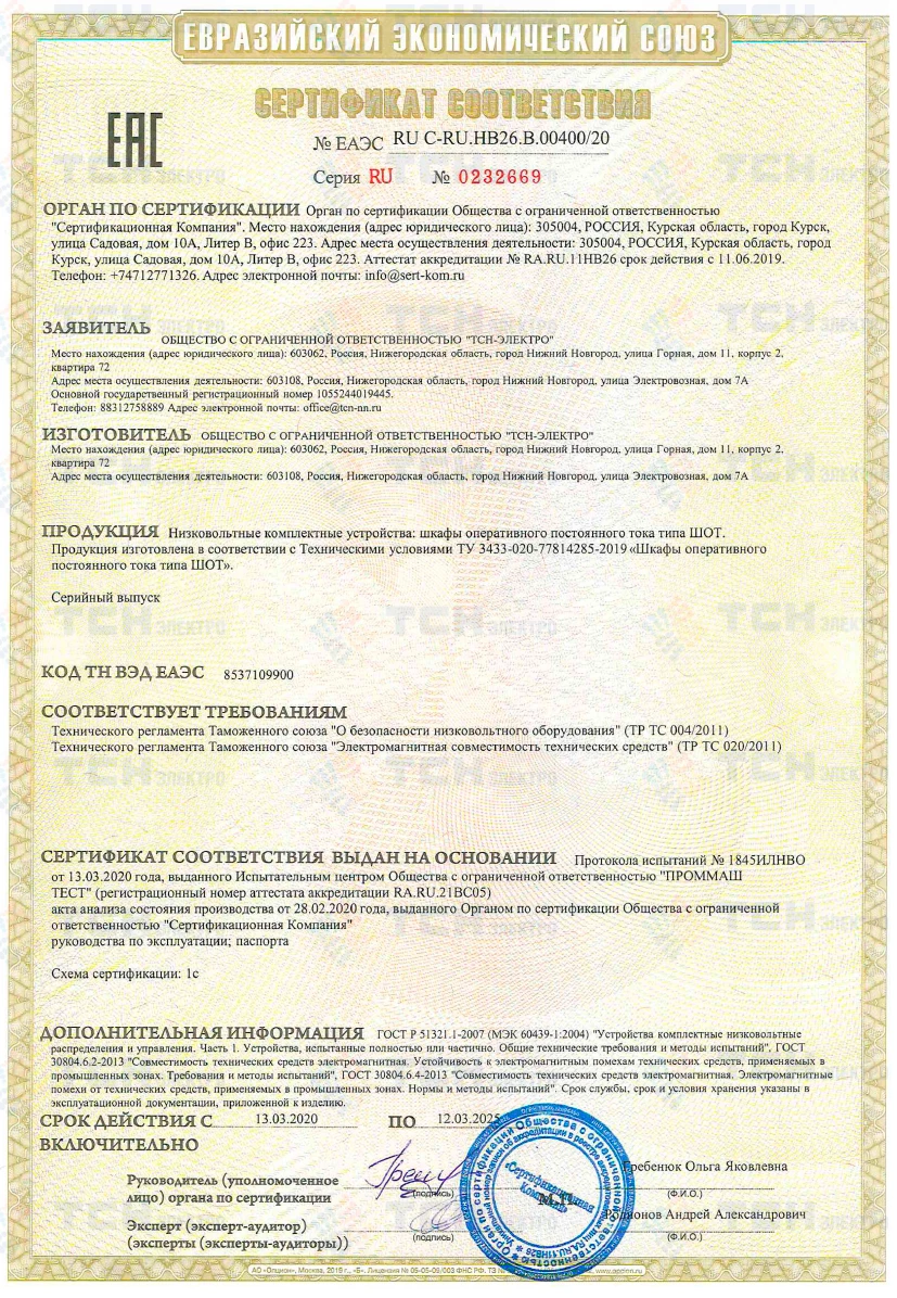 Сертификат соответствия НКУ типа ШОТ требованиям ТР ТС