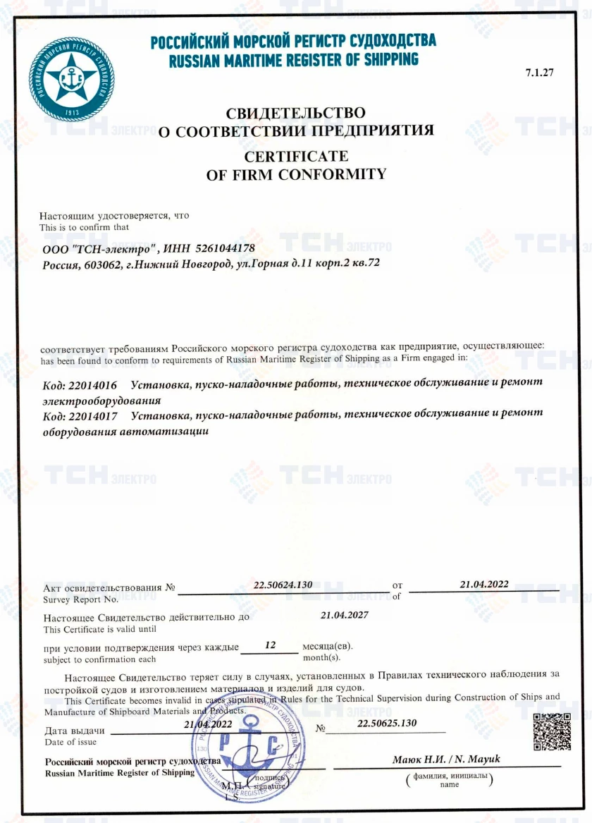 Свидетельство о соответствии предприятия российскому морскому регистру судоходства