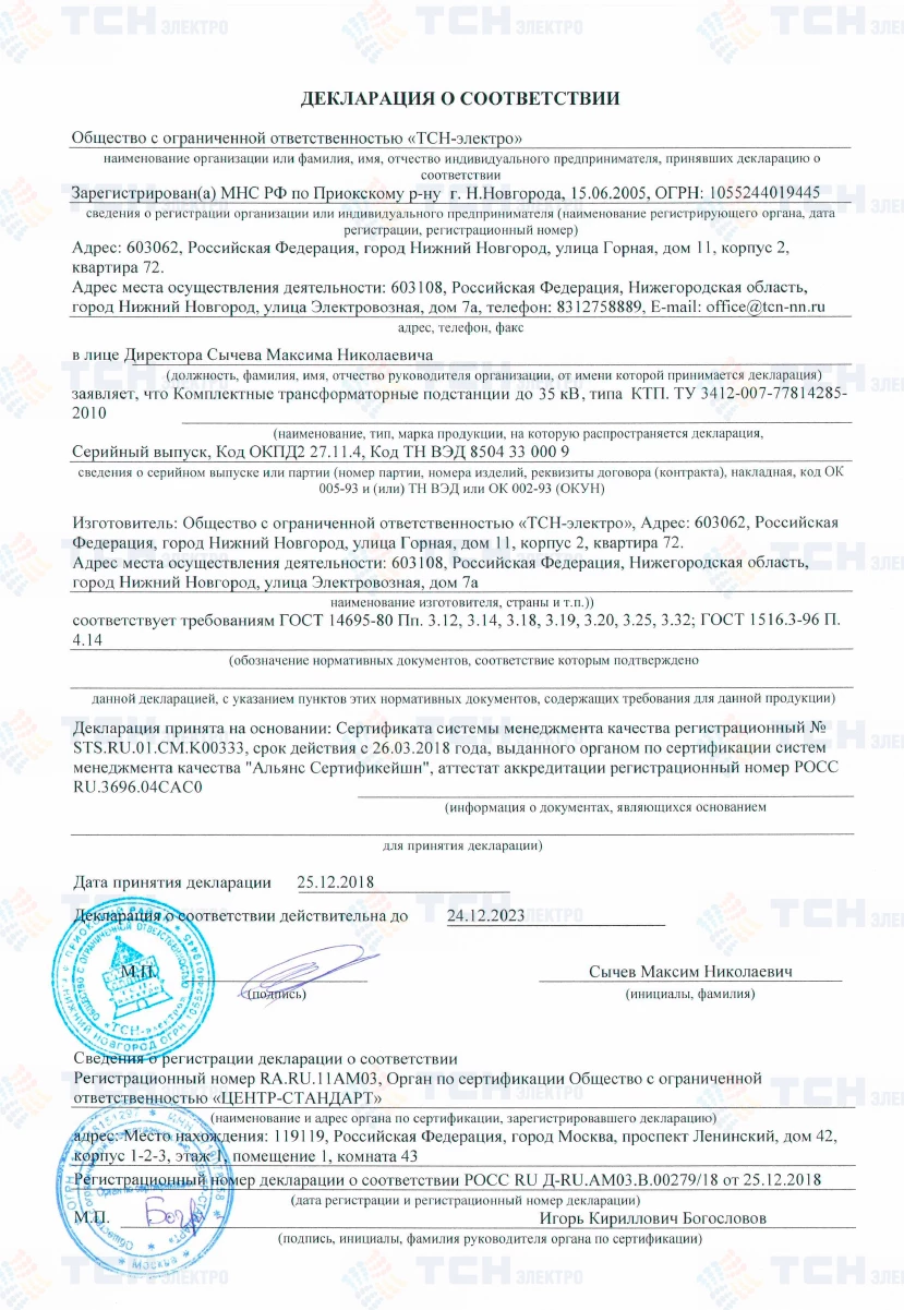 Декларация о соответствии КТП до 35 кВ требованиям ГОСТ