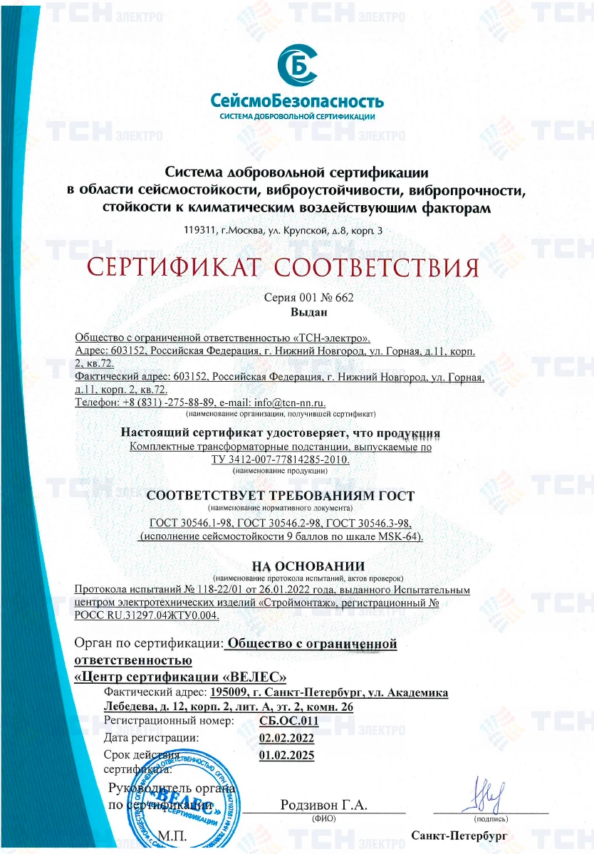 Сертификат соответствия КТПУ и КТП требованиям сейсмостойкости