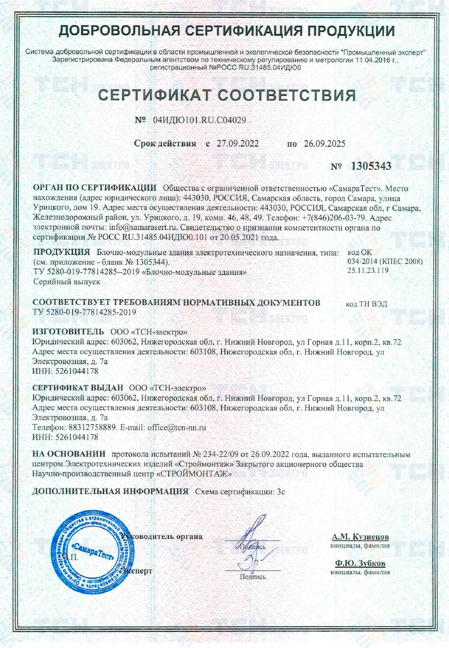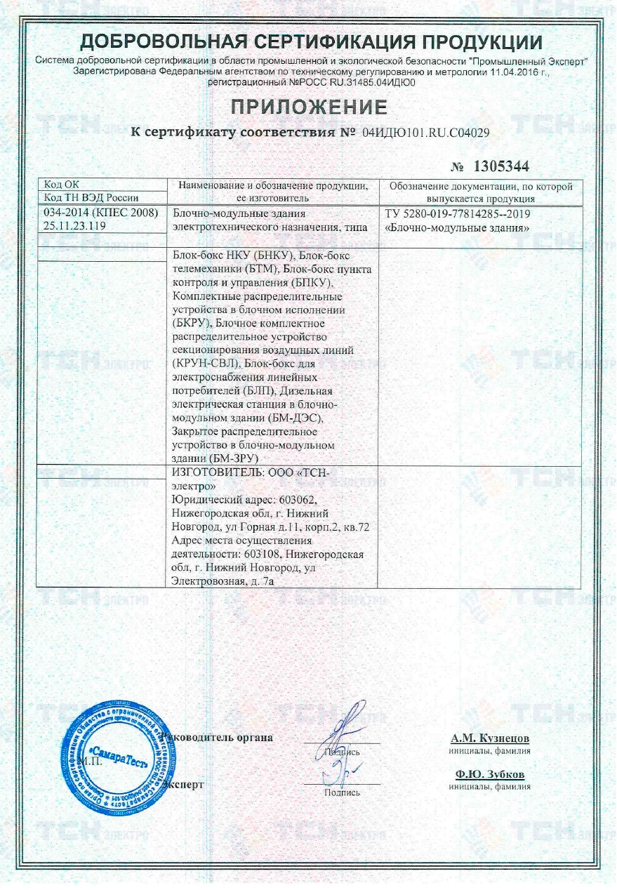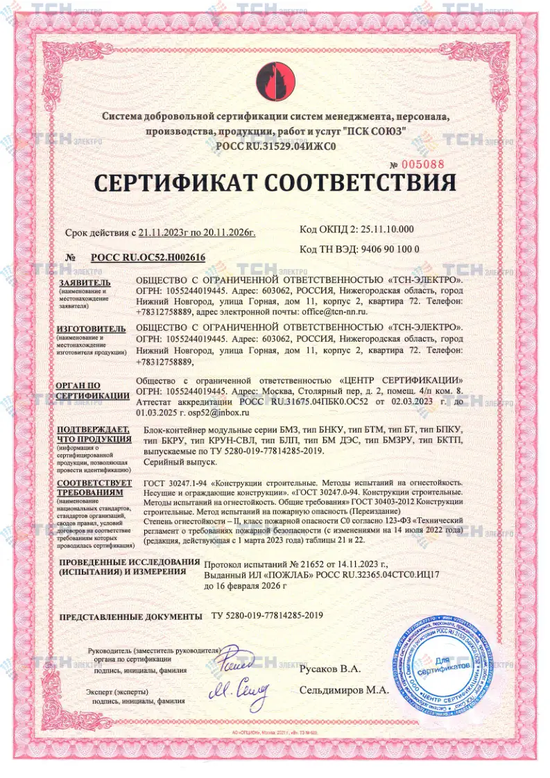 Сертификат соответствия БМЗ типов БНКУ, БТМ, БТ, БПКУ, БКРУ, КРУН-СВЛ, БЛП, БМ ДЭС, БМЗРУ требованиям пож. безоп.