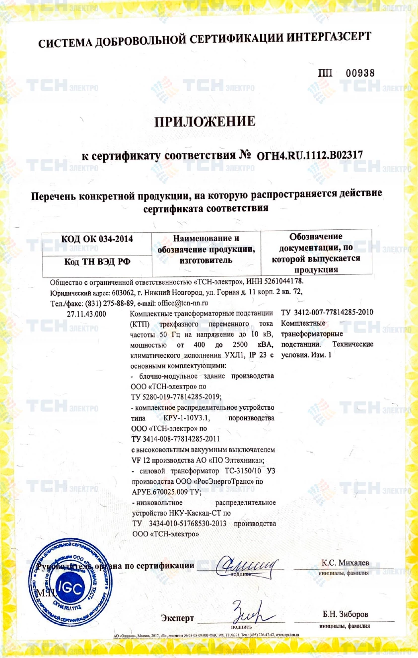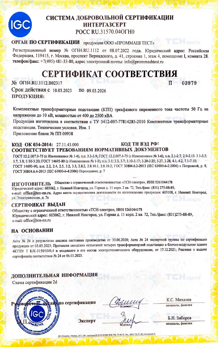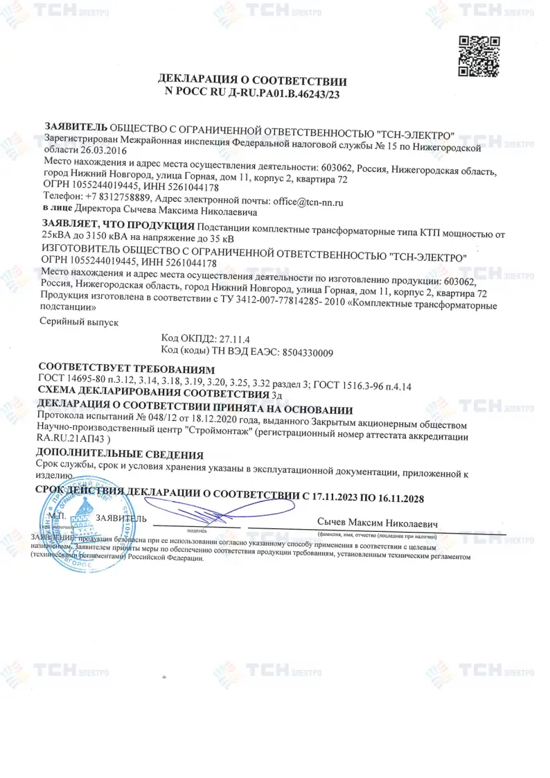 Декларация о соответствии КТП мощностью до 3150 кВА на напряжение до 35 кВ требованиям ГОСТ