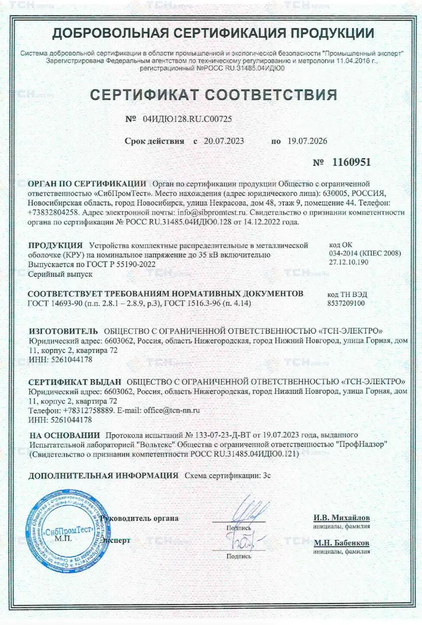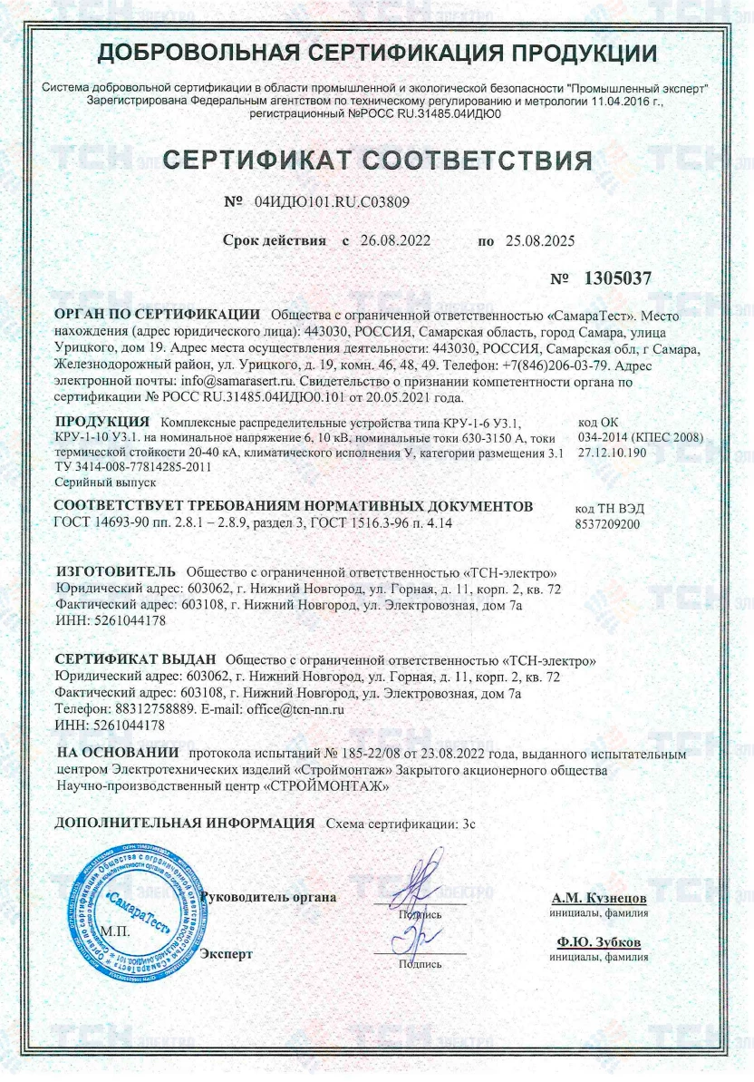 Сертификат соответствия КРУ до 35 кВ требованиям ГОСТ