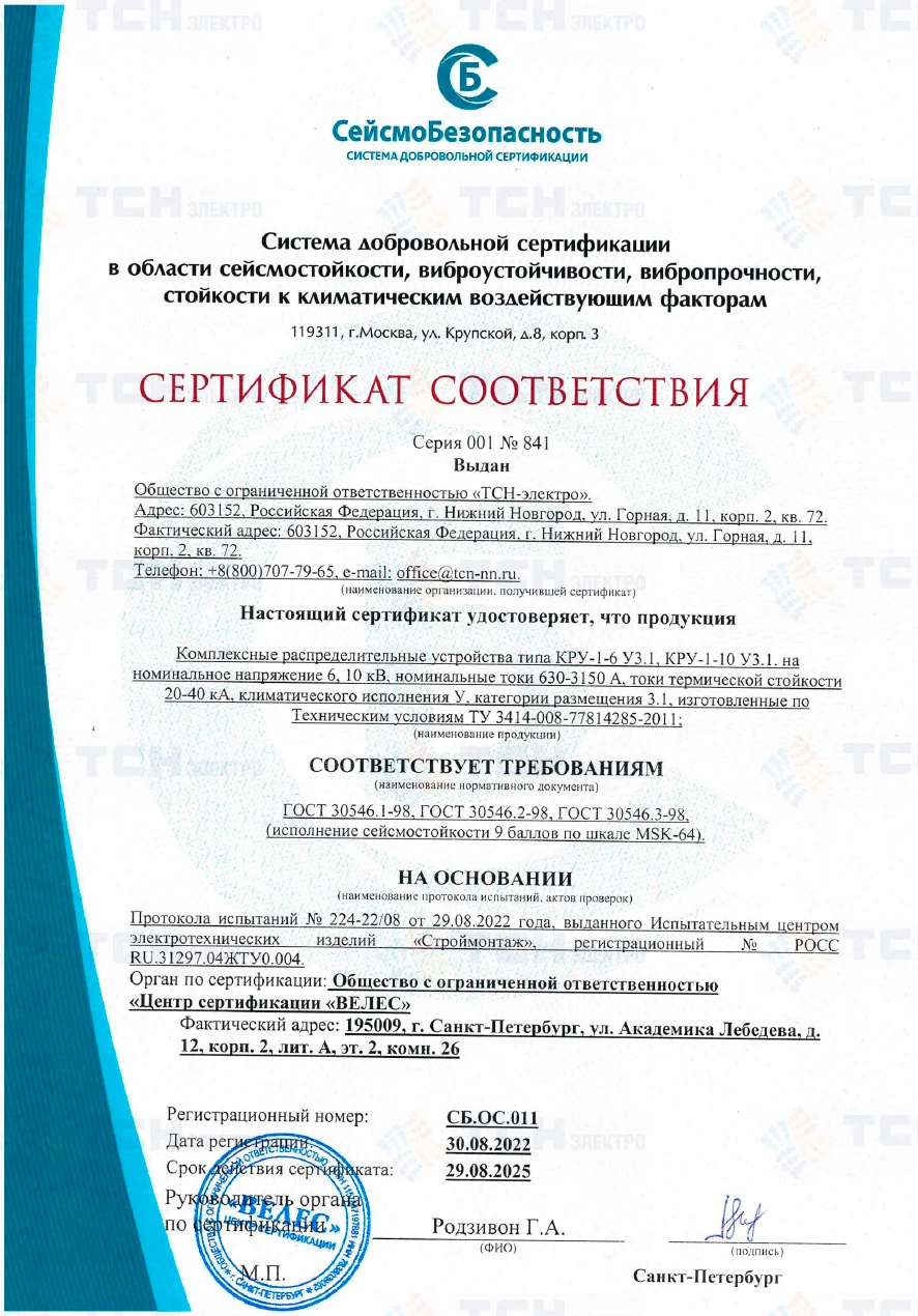 Сертификат соответствия КРУ-1-6 УЗ.1, КРУ-1-10 УЗ.1 требованиям сейсмостойкости