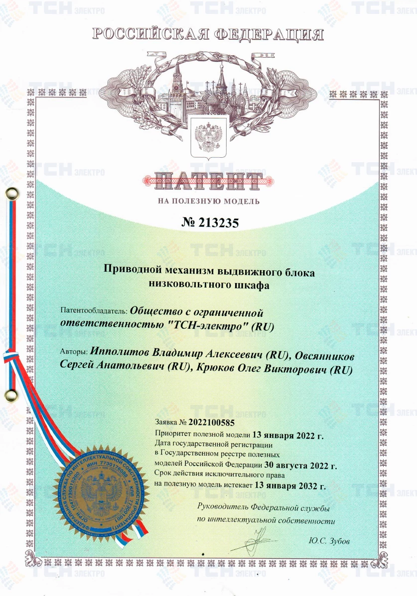 Патент на полезную модель «Приводной механизм выдвижного блока низковольтного шкафа»
