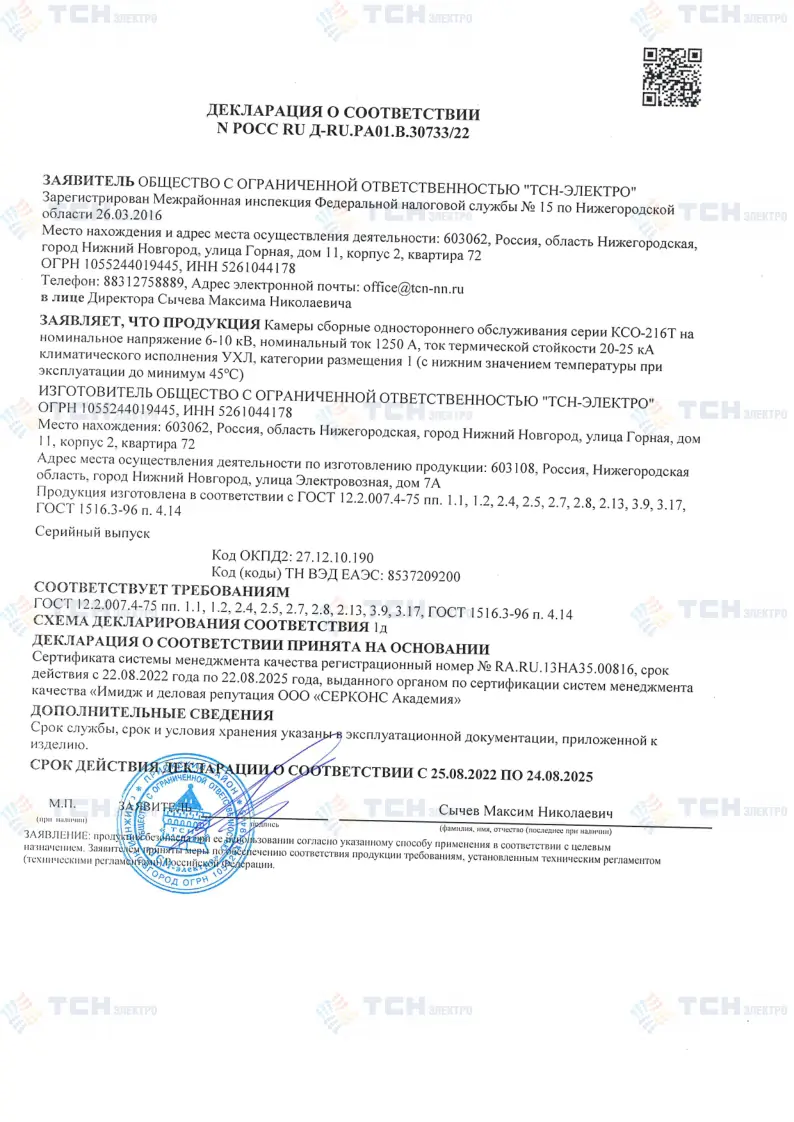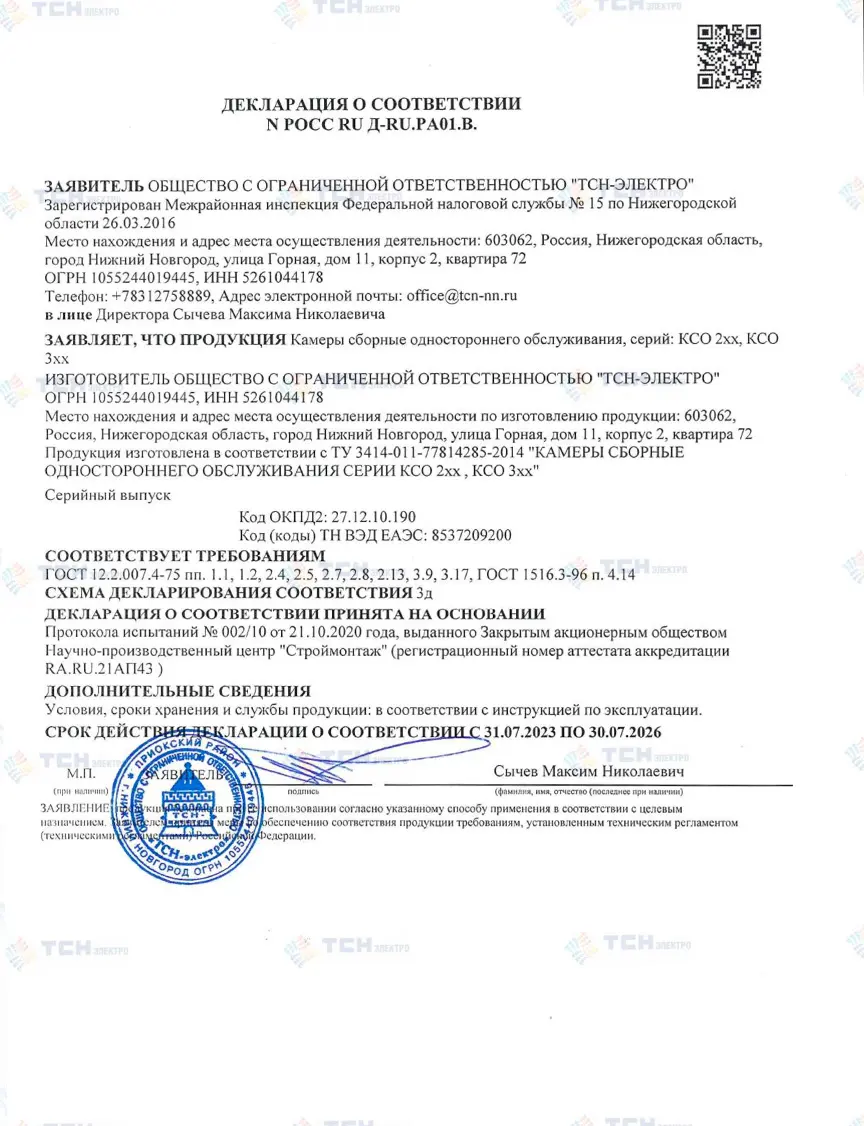 Декларация соответствия КСО-216Т на номинальное напряжение 6-10 кВ, номинальный ток до 1250 А