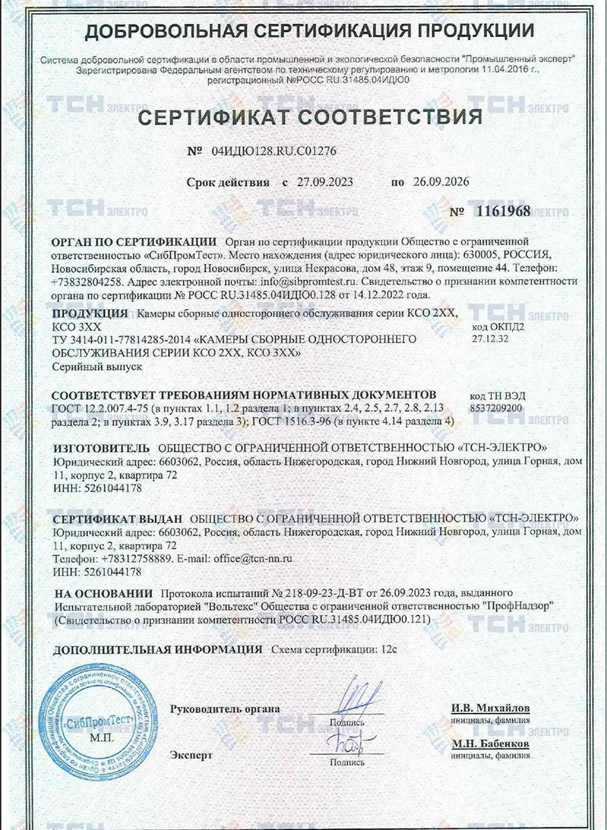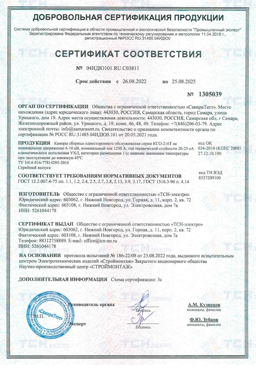 Сертификат соответствия КСО-216Т на номинальное напряжение 6-10 кВ, номинальный ток до 1250 А