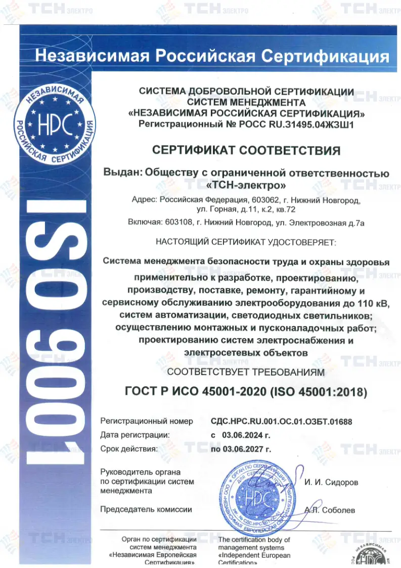 Сертификат соответствия системы охраны труда и безопасности персонала требованиям ГОСТ Р 45001_2020