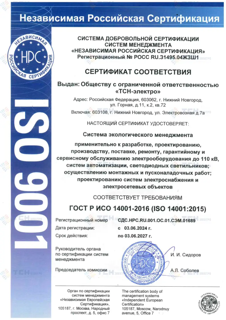 Сертификат соответствия соответствия системы экологического менеджмента требованиям ГОСТ ISO 14001_2016