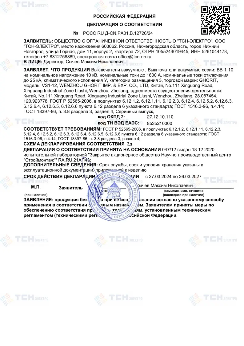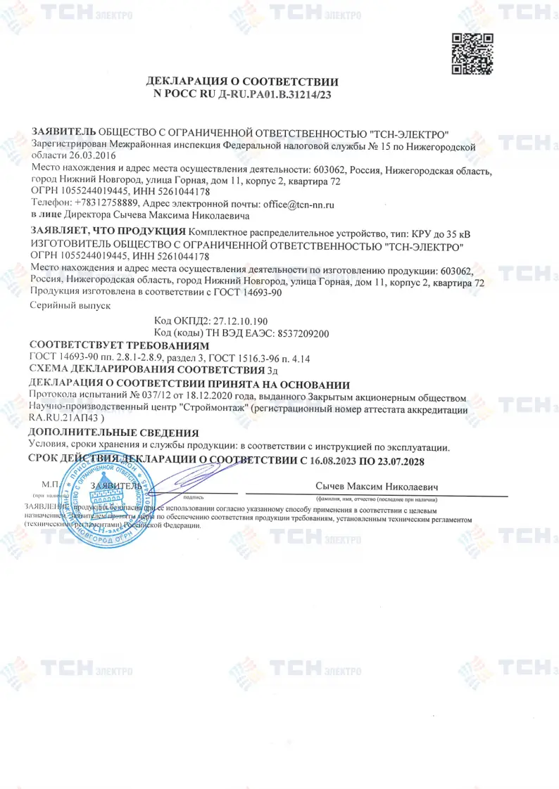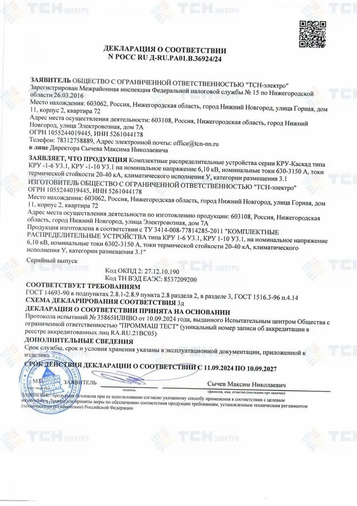 Декларация о соответствии КРУ до 35 кВ требованиям ГОСТ
