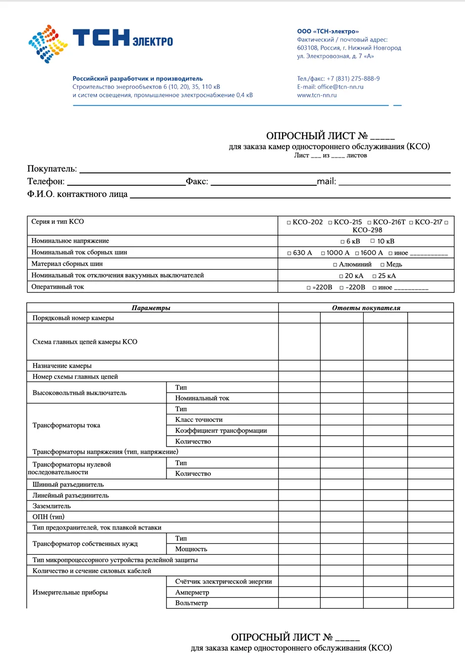 Опросный лист для заказа камер КСО серии 2ХХ