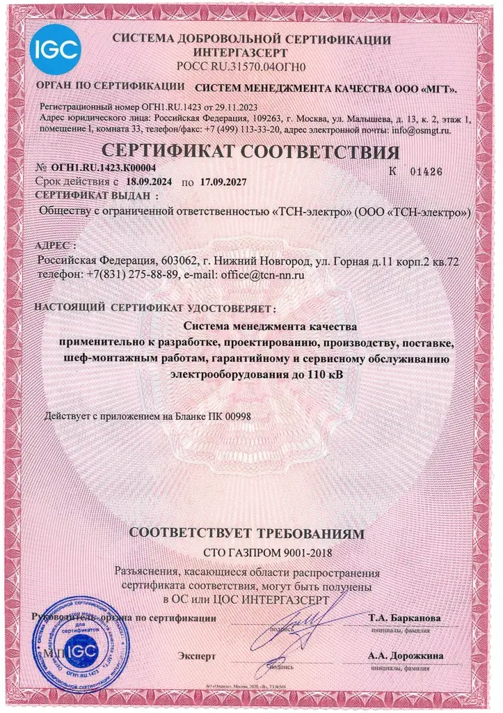 Сертификат соответствия системы менеджмента качества требованиям стандарта ГОСТ ISO 9001_2015