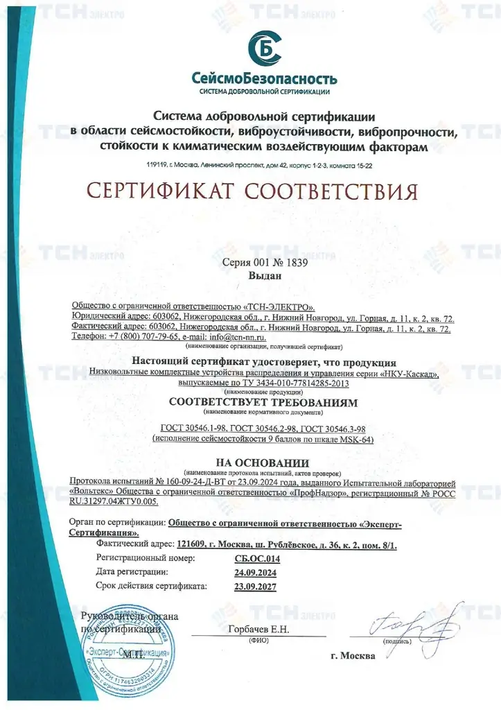 Сертификат соответствия НКУ требованиям сейсмостойкости