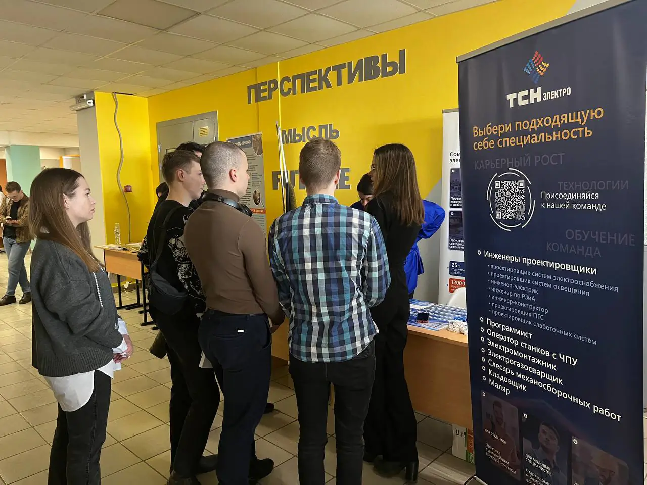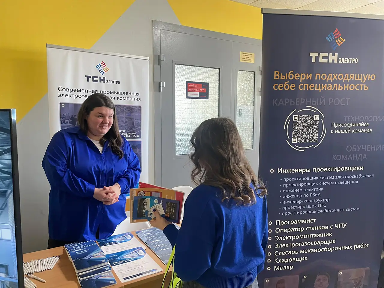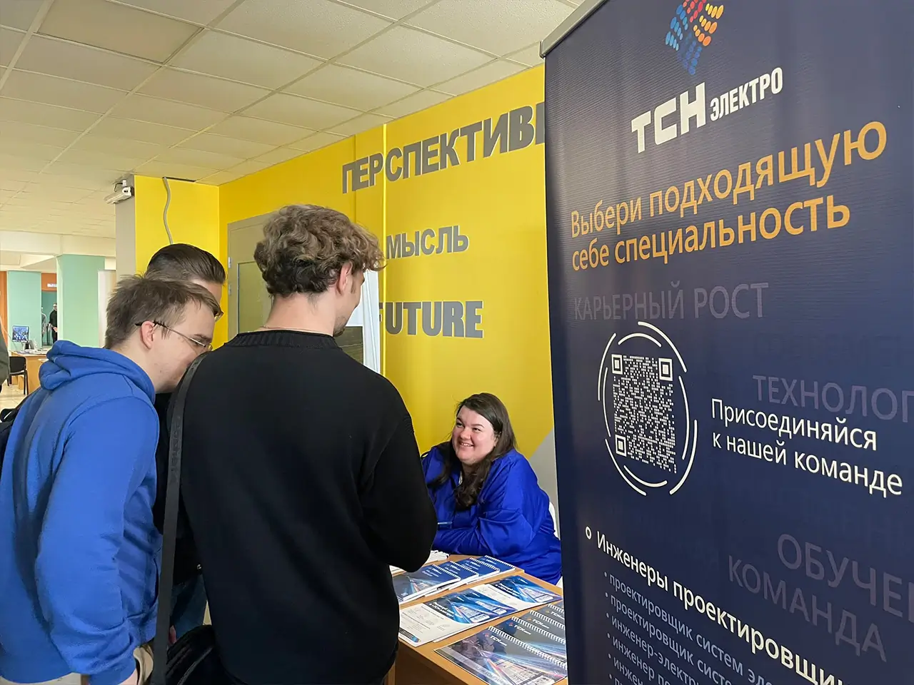 На стенде нашей компании сотрудники не только рассказали о предприятии, но и с помощью презентаций и видеороликов показали, какими интересными профессиями могут заниматься выпускники, а студентам раскрыли дополнительные плюсы прохождения практики у нас. Особенно приятным бонусом для компании стало окружение наших заказчиков, с которыми мы успешно сотрудничаем уже много лет. Поэтому студентам было легко и доступно прямо на месте продемонстрировать референции и масштаб работы «ТСН-электро».
